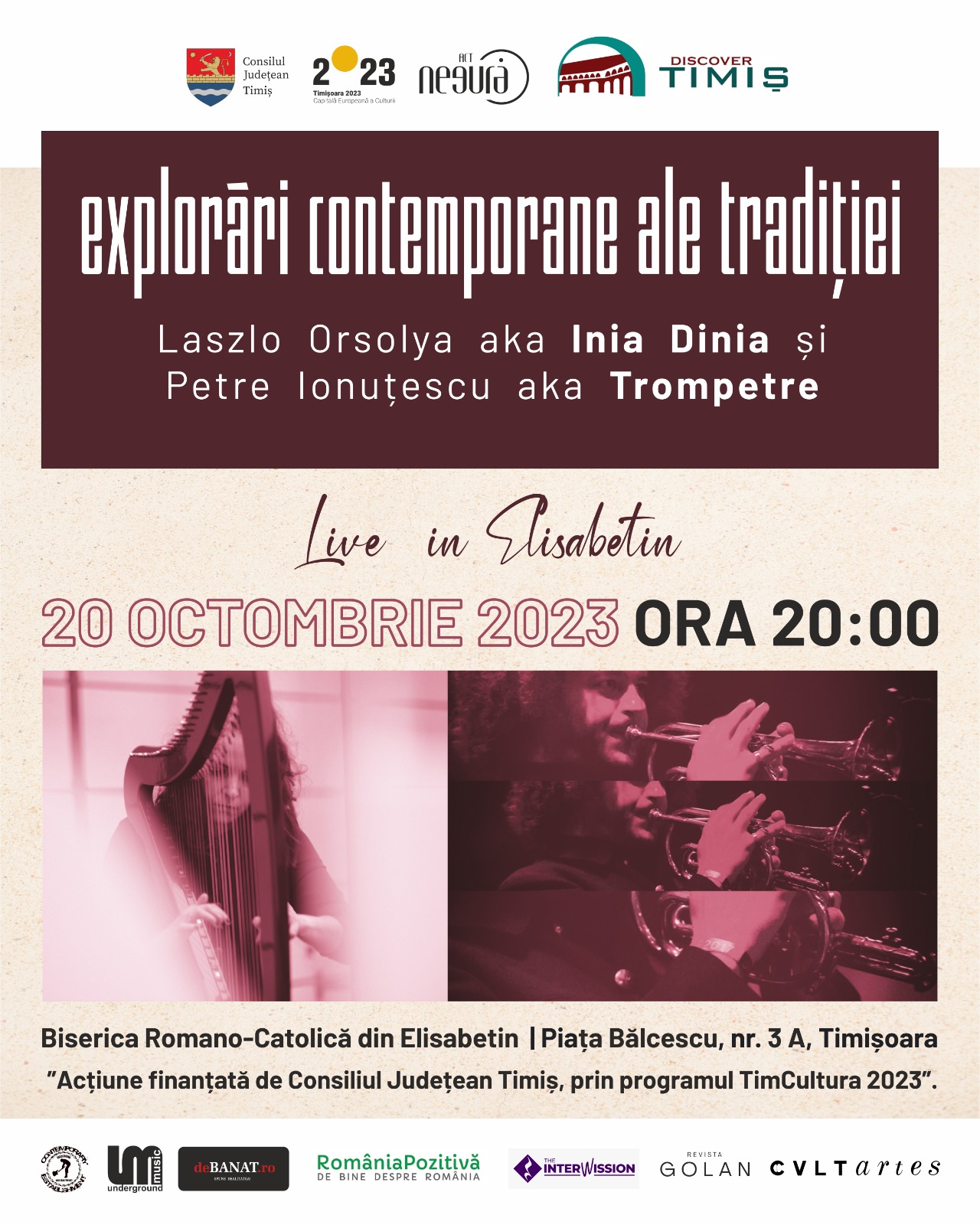 Pe data de 20 octombrie, la Biserica Romano-Catolică din Elisabetin, Timișoara, la ora 20:00 sunteți invitați la un concert inedit alături de doi instrumentiști cunoscuți, Petre Ionuțescu aka Trompetre și Laszlo Orsolya aka Inia Dinia. Cei doi vor crea un concert original, pornind de la teme din muzica tradițională, într-o demonstrație excepțională de improvizație.